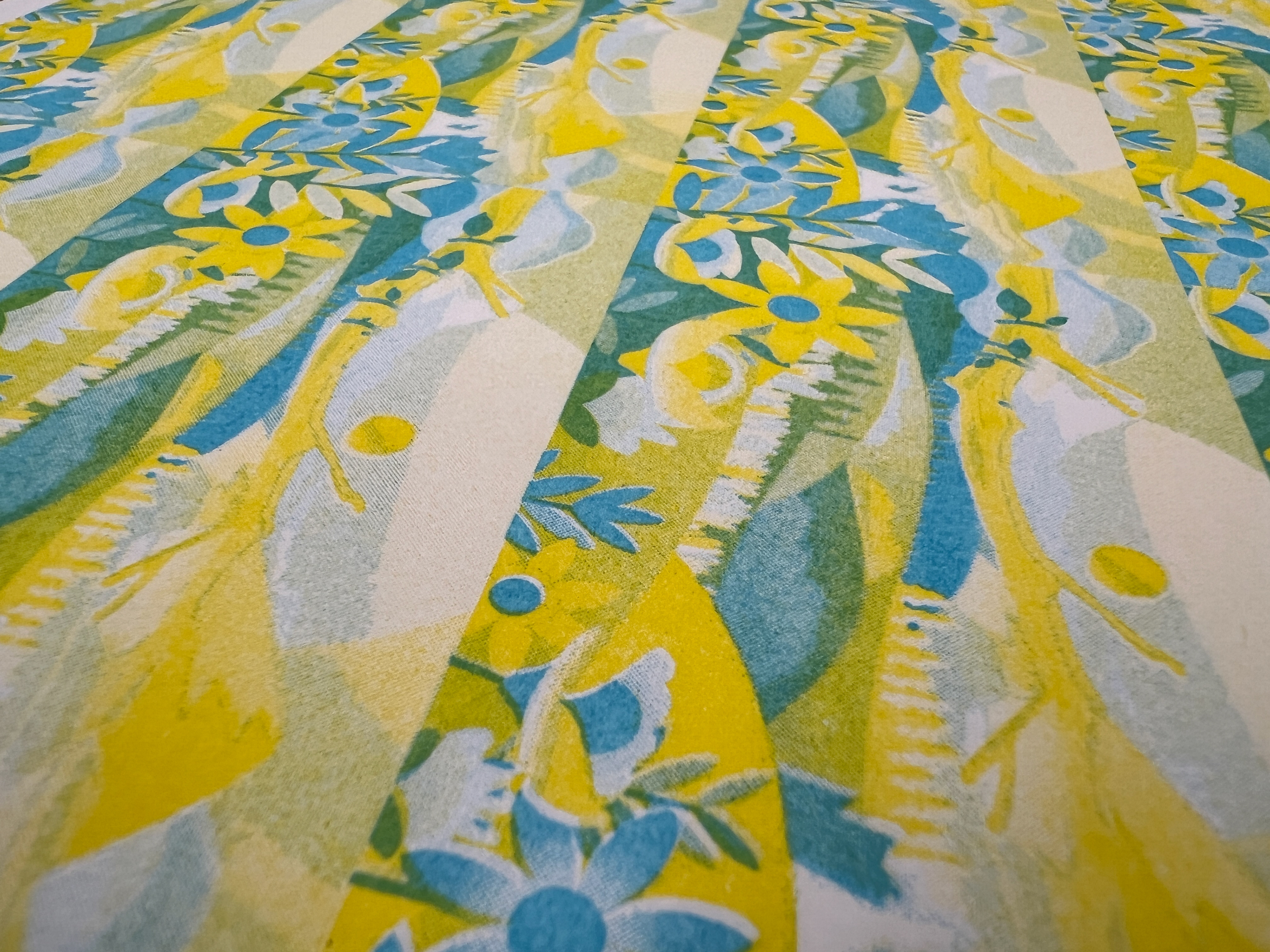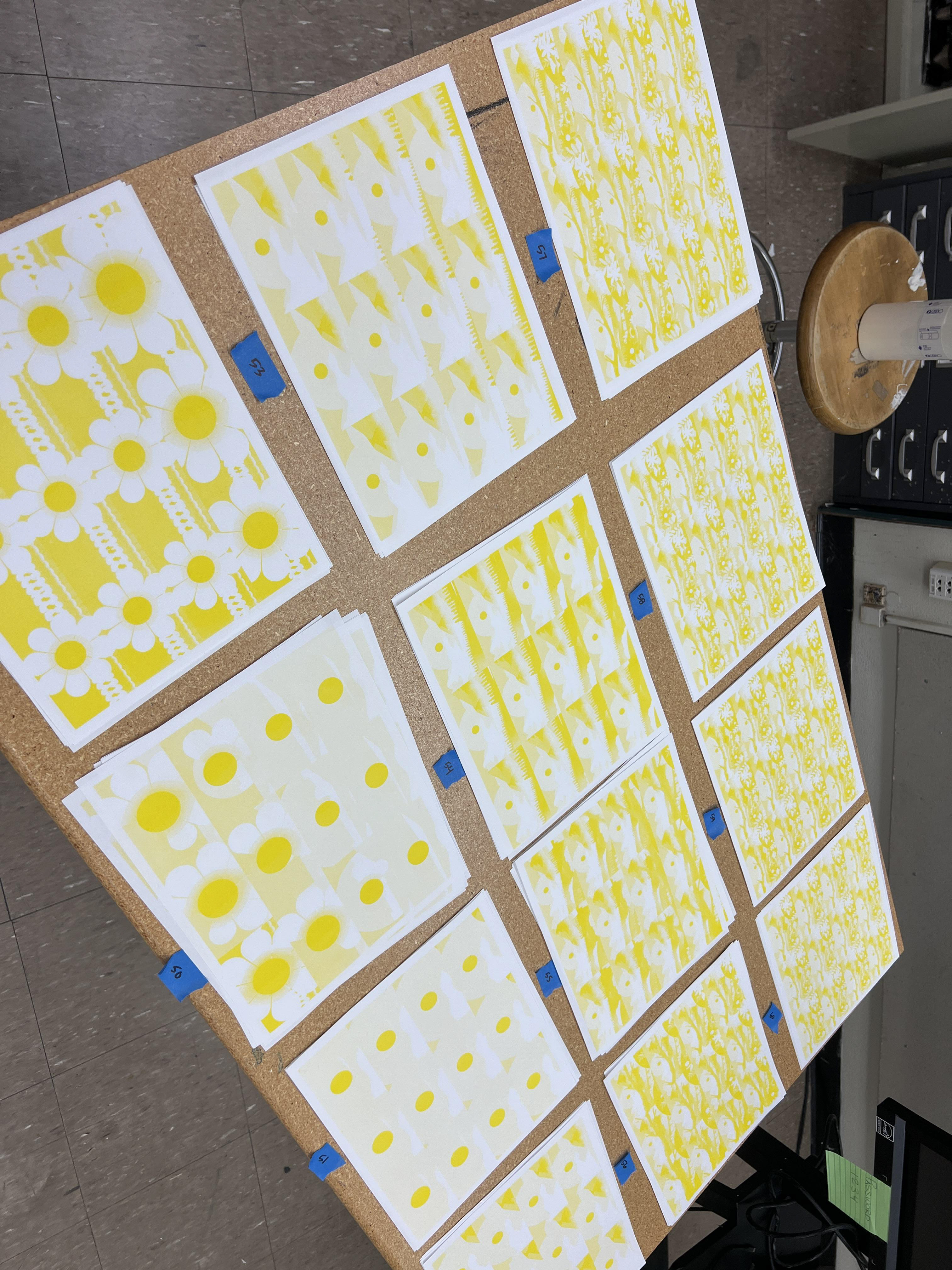 I started with yellow (working light to dark), then layered the cyan by running these same copies through the machine again to overlay on top of the yellow.